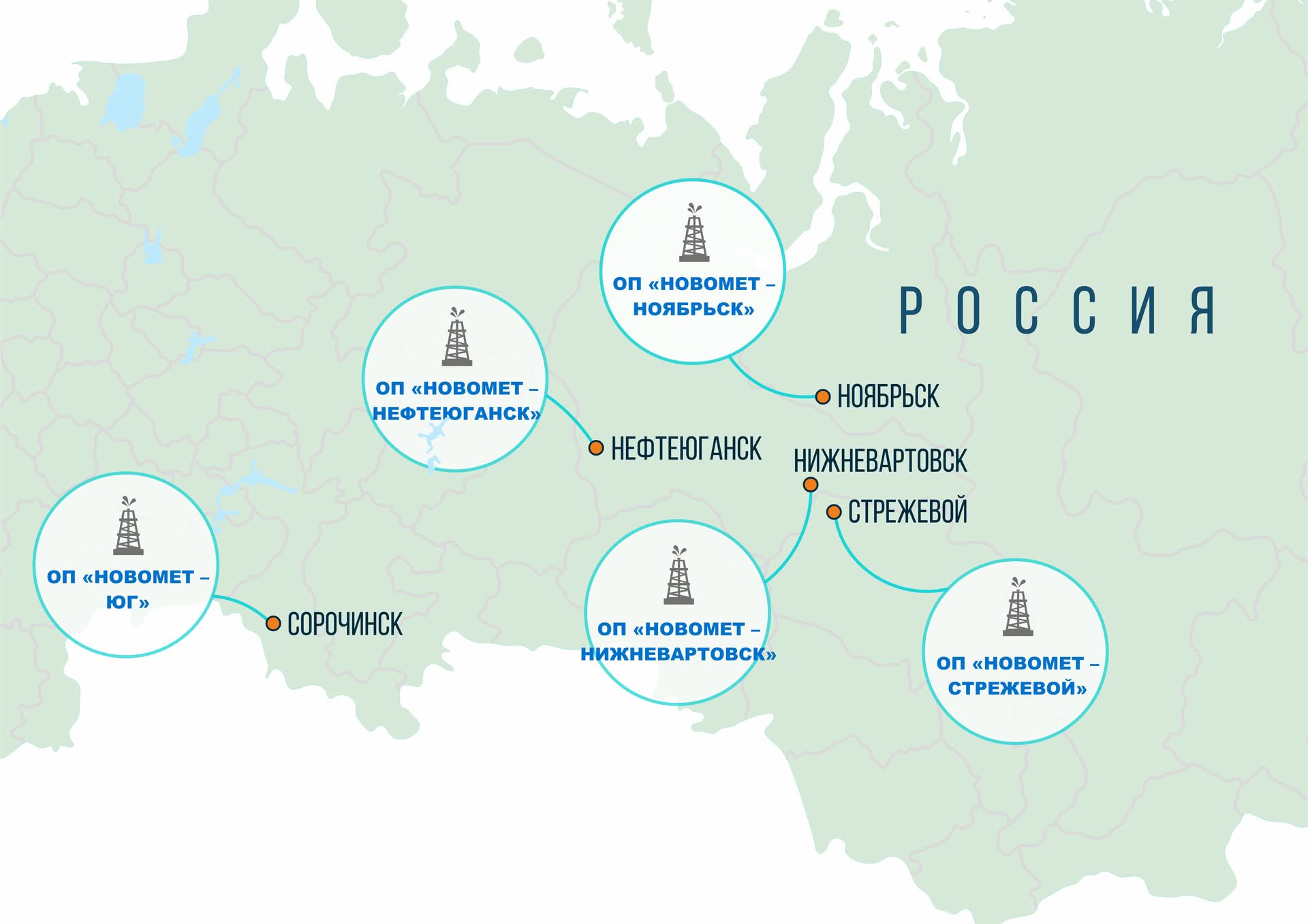 Сервисные базы Новомета расположены в главных нефтедобывающих регионах страны, что максимально логистически удобно для обслуживания заказчиков. Это пять обособленных подразделений – ОП «Новомет-Ноябрьск», ОП «Новомет-Нефтеюганск», ОП «Новомет-Нижневартовск», ОП «Новомет-Стрежевой» и ОП «Новомет-Юг» (г.Сорочинск). Вместе они покрывают огромную территорию и работают на месторождениях по всей стране – в Ямало-Ненецком автономном округе, Ханты-Мансийском автономном округе, Якутии, Удмуртии, Иркутской, Ульяновской, Томской, Оренбургской, Самарской областях, Краснодарском крае.